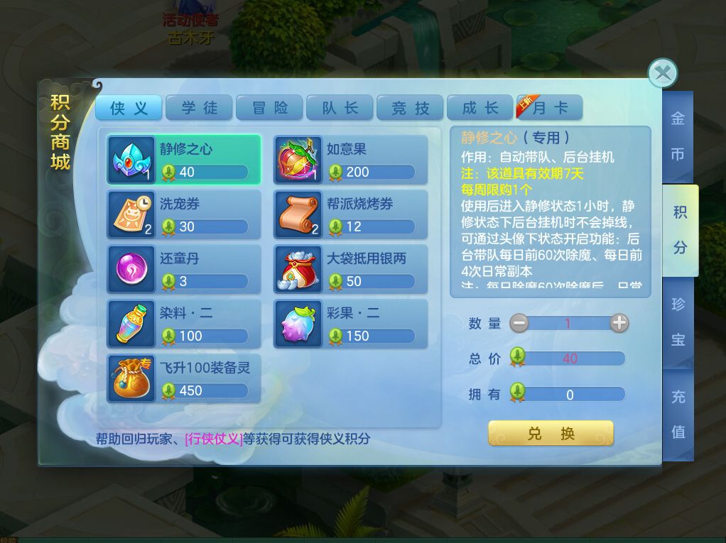 2)帮助他人完成每日挑战、星辰下凡等挑战活动且自身不获得奖励时,不再获得学徒积分,调整为获得侠义积分,部分难度可获得双倍积分;