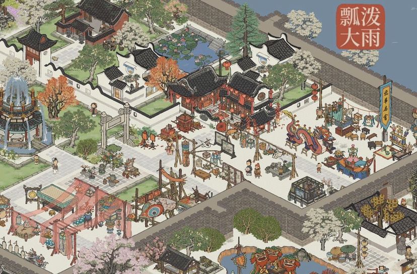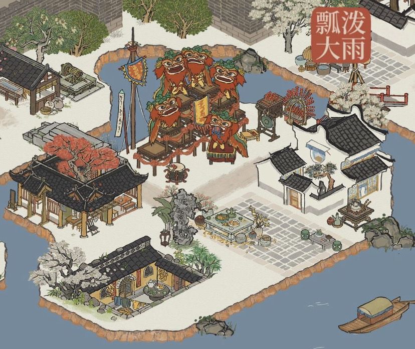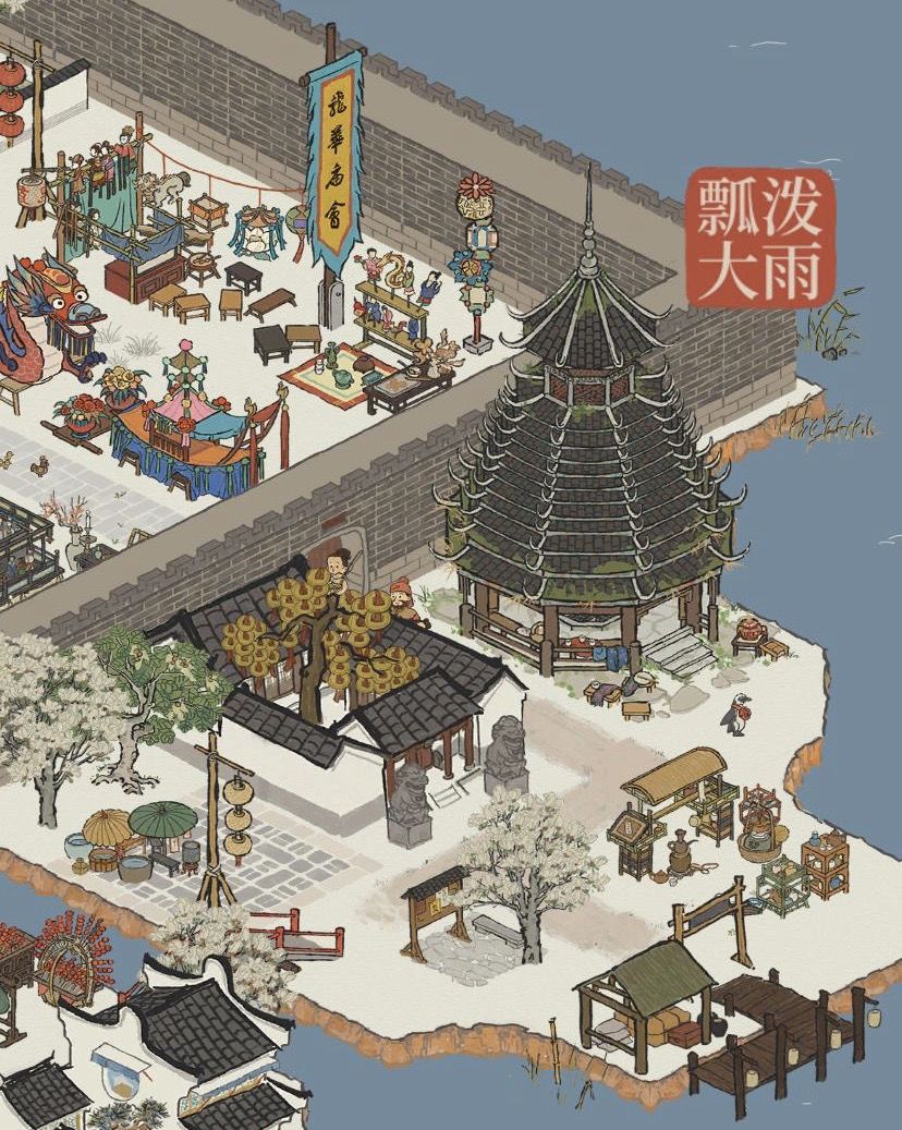 【积翠岛】&【观鹤岛】:主打庆典节日气氛,以飞泉亭为广场中心,周围摆放三星灯,醮祭大典以红色为主要颜色,展现热闹市集场景。