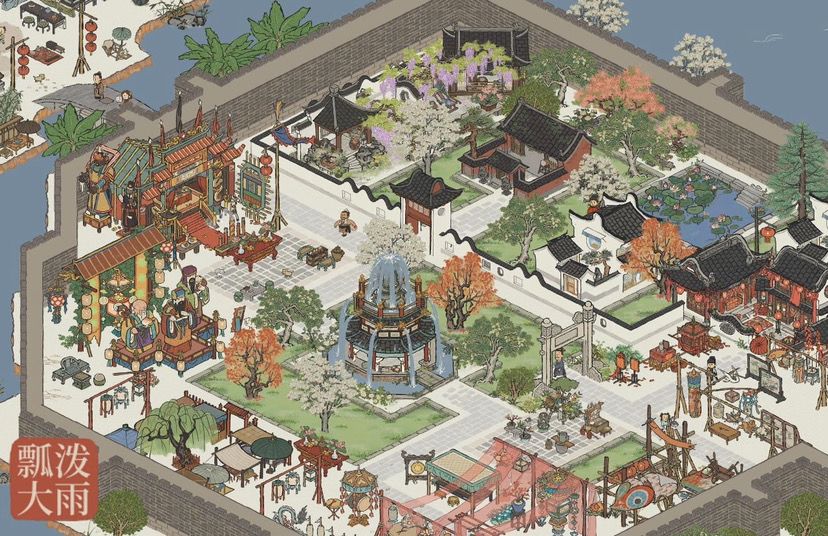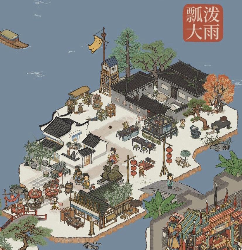 本次布局主题主打集市摊贩,无生产摆放,纯娱乐建筑进行摆设,全图仅5幢民宅,全局展示: