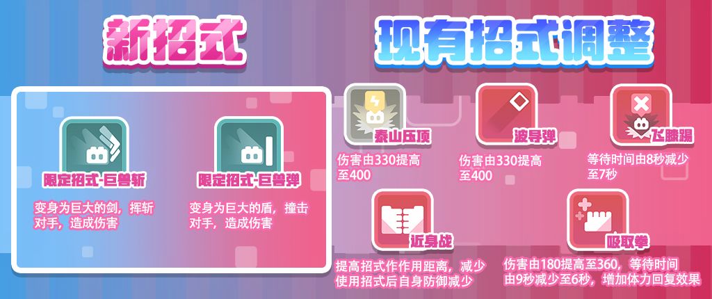 并且,在剑盾之王新版本中,还将新增巨兽斩、巨兽弹等新招式,现有招式泰山压顶、波导弹、飞膝踢、近身战、吸取拳等,则是进行了一定调整,方便探险家们更好地驰骋方可乐岛。那么,剑盾之王新版本已然开启,诸多福利、活动也已就位!探险家们还在等什么!不妨一起踏上新的征程!