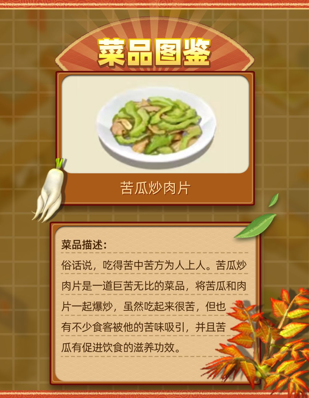 🌰菜品描述:俗话说,吃得苦中苦方为人上人。苦瓜炒肉片是一道巨苦无比的菜品,将苦瓜和肉片一起爆炒,虽然吃起来很苦,但也有不少食客被他的苦味吸引,并且苦瓜还有促进饮食、消炎退热、防癌抗癌和降低血糖的滋养功效。
