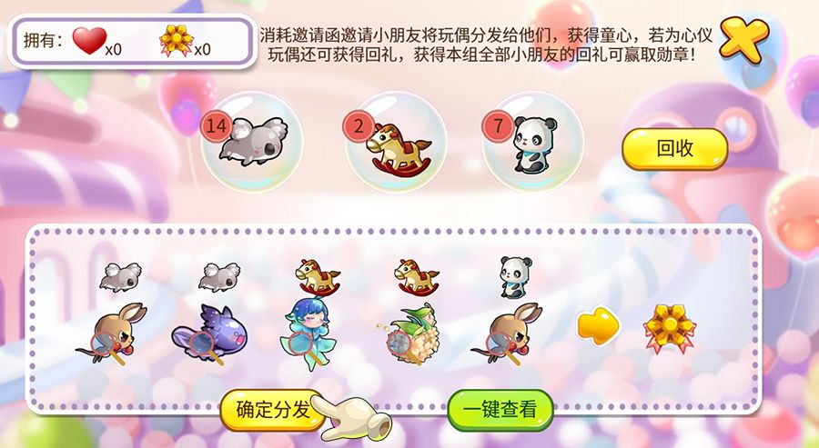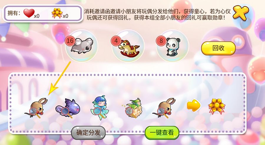 在扭蛋中获得的小玩偶,到童梦守护中送给小朋友,获得爱心和勋章积分啦~