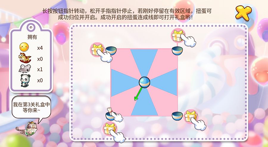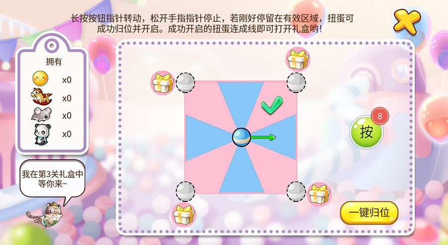 长按按钮转动指针,在粉色区域停下,扭蛋成功归位并开启,成功开启的扭蛋连城线即可打开礼盒领取奖励~