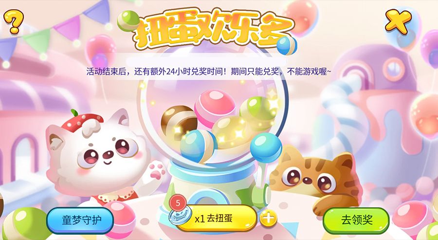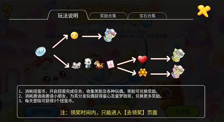 1、本活动分为三部分:去扭蛋、童梦守护、去领奖;