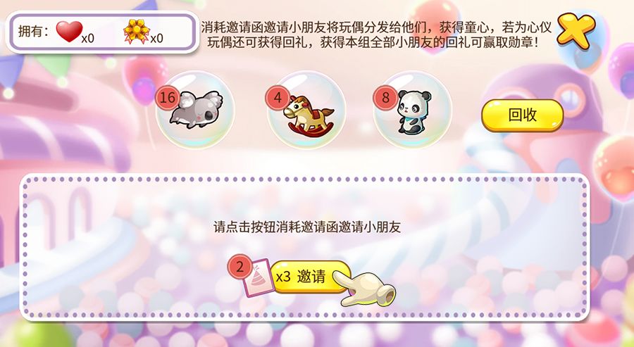 点击邀请函,邀请小朋友。将三种玩偶分发给小朋友们~