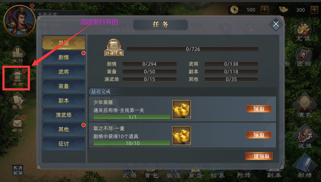 这个位置我觉得不用介绍了,因为大家来字面意思就懂了,唯一要说的就是这里就是搞福利的,打关卡得元宝,剧情关卡相关的成就这里面没写明白的,大家在战场点情报可以看到提示的。
