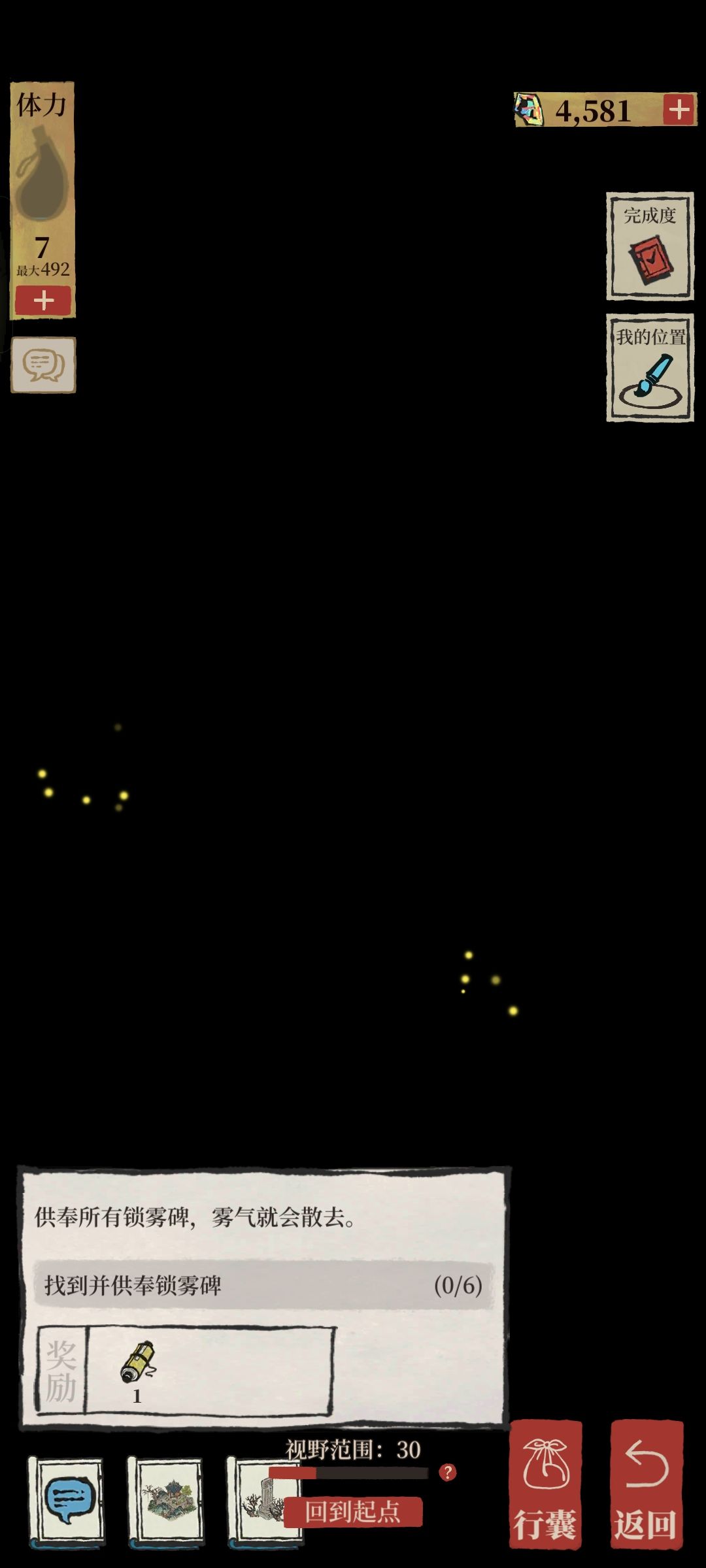 4.找杨梅看起来较难,其实很简单,到处走走总能找到,要找树上结红果的杨梅树,点击巨石或者杨梅树(没有红果果的)会缩小视野范围,其中发亮的地方是石碑可恢复视野,大概在原始位置左上角一点