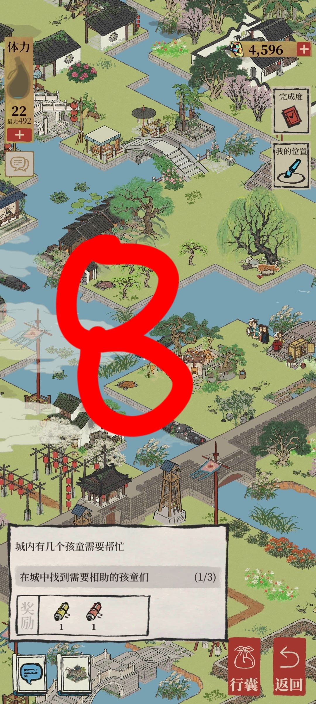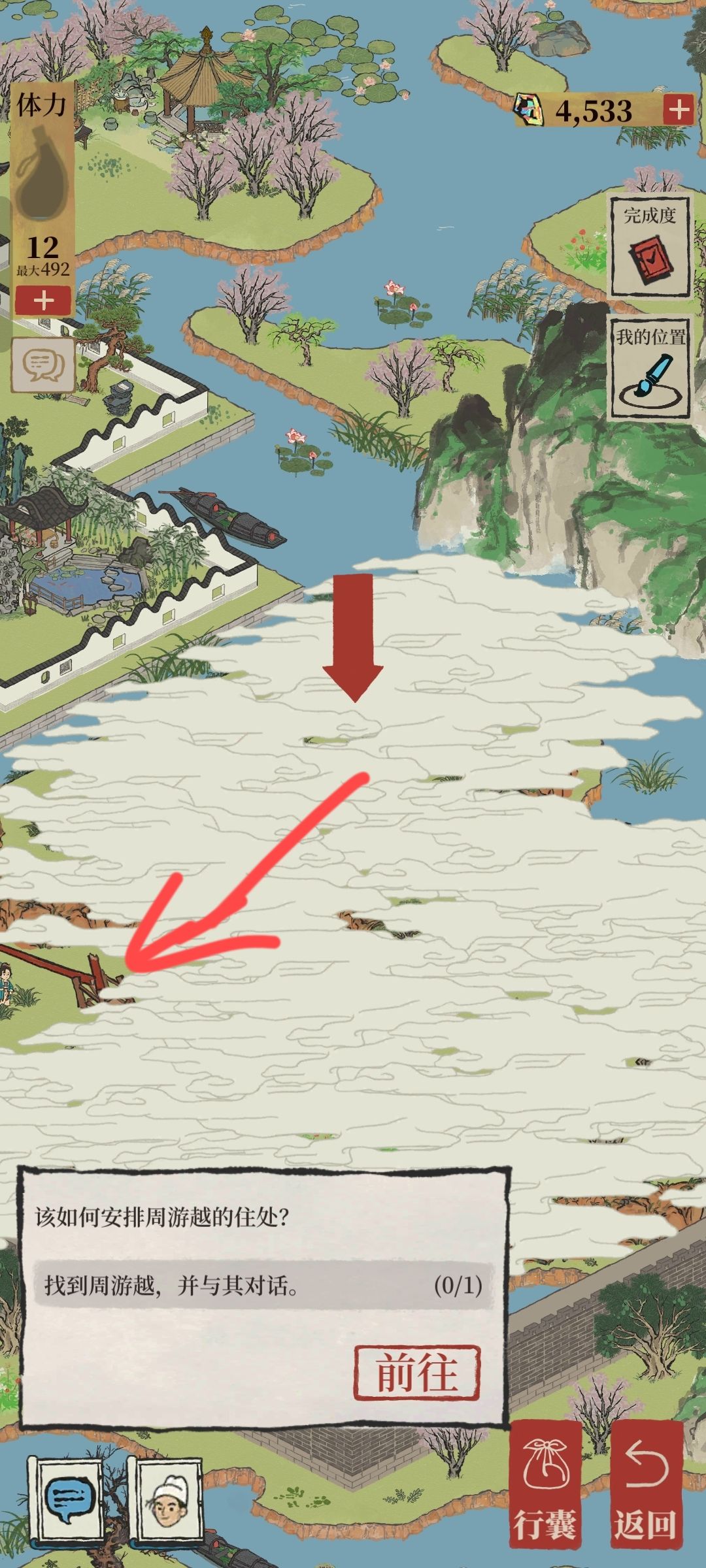 6.到达下图任务时,可顺便点击乌篷船,修复箭头废墟,找到第一个宝箱,按左下到达画图桌时,记得点击旁边的乌篷船