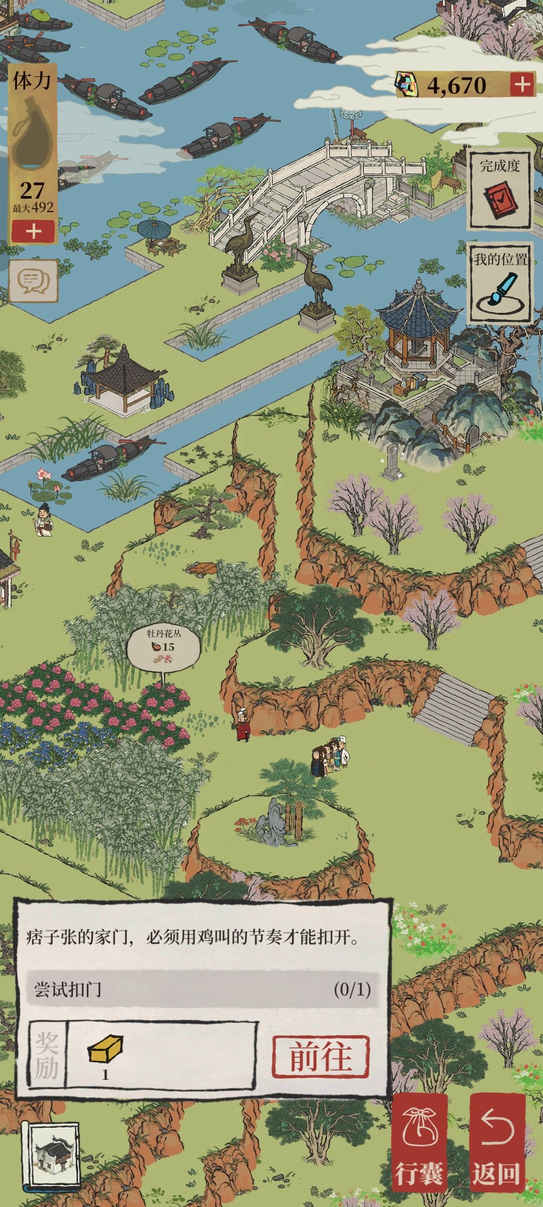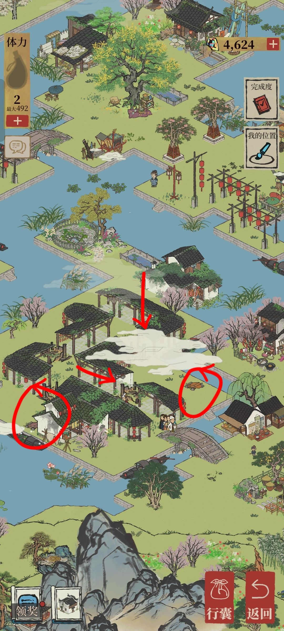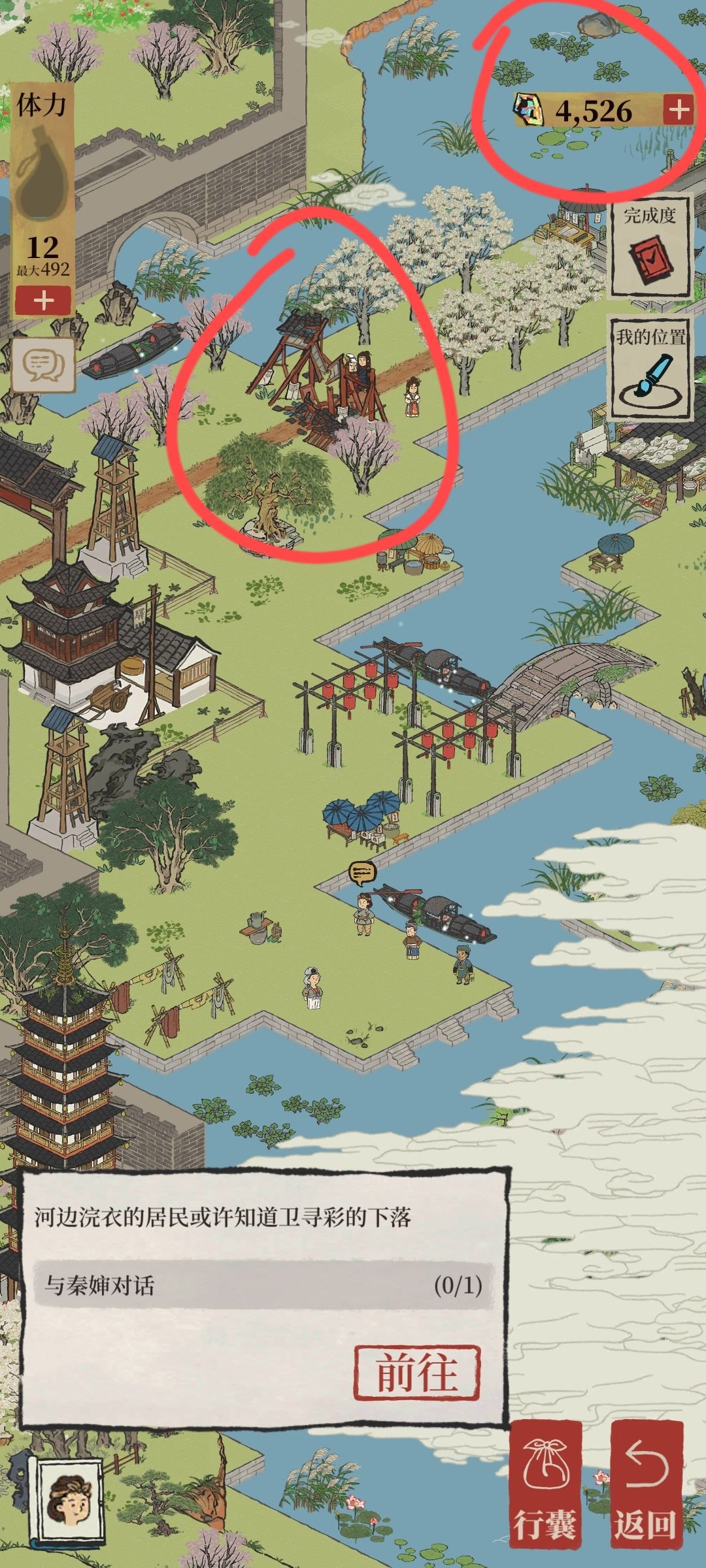 2.铜鹤相对,需按下图红箭头指引除去百合花和紫叶李到达铜鹤,其中所需玉山果需点击下图标出的发光乌篷船,可额外获得补天石(下面乌篷船就不标了,发光的可以点击,比较好找,都在城中河里)
