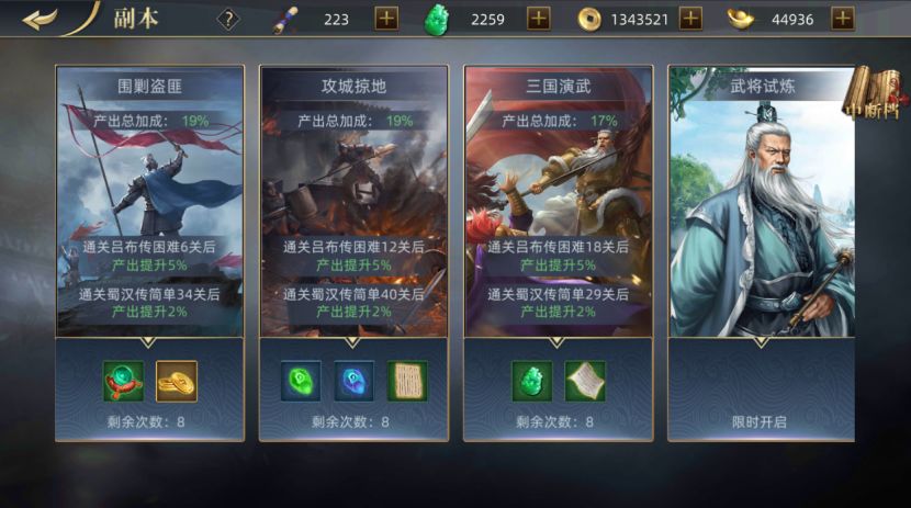 副本是这个游戏最大且是最轻松的资源获取点,大家一定每天都要来扫荡,那么来看看副本都可以收到什么,点开副本可以看到四种副本资源收益。
