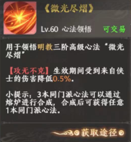 三阶高级心法微光尽熠,又是一个群架型天赋,点满后自带5%的PVP减伤,比较不错,可以叠加白泽的减伤使用。