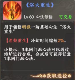 一阶心法,浴火重生,减少明教复活技能20%冷却时间,让这技能从10分钟降至8分钟,如果你是喜欢打问鼎江山这种群架的可以点满。
