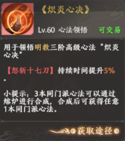 三阶高级心法炽炎心决,必点且必须要点满,可以提升50%怒斩十七刀的持续时间,大大减少咱们因为技能循环出错,没法把最巅峰一刀用于劈龙斩日的失误操作。
