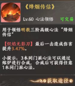 三阶高级心法,烽烟传信,只强化了无影刀最后一刀的伤害,属于是一个比较鸡肋的心法。