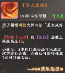 大师心法圣火成海,也是属于必点天赋,能让怒斩十七刀变成十八刀,让明教最后一刀的伤害拥有恐怖350%增伤,打出全门派最高的爆发伤害。