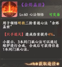 二阶心法余烬盖世,提升只手遮天的伤害,也是个可点可不点的技能,且性价比略逊于借阳。