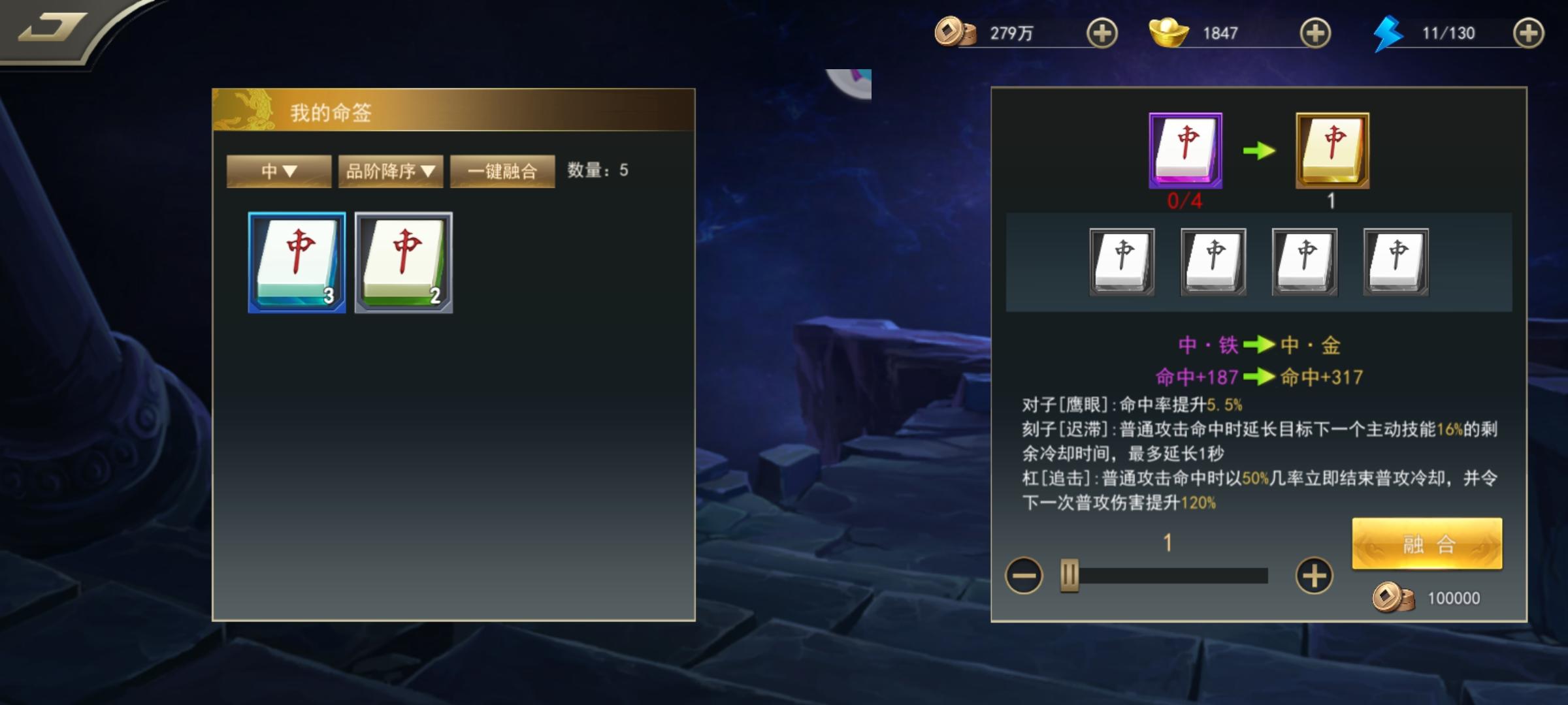 从武将的命签点入有一键融合!包裹里的命签融合没有一键融合!
