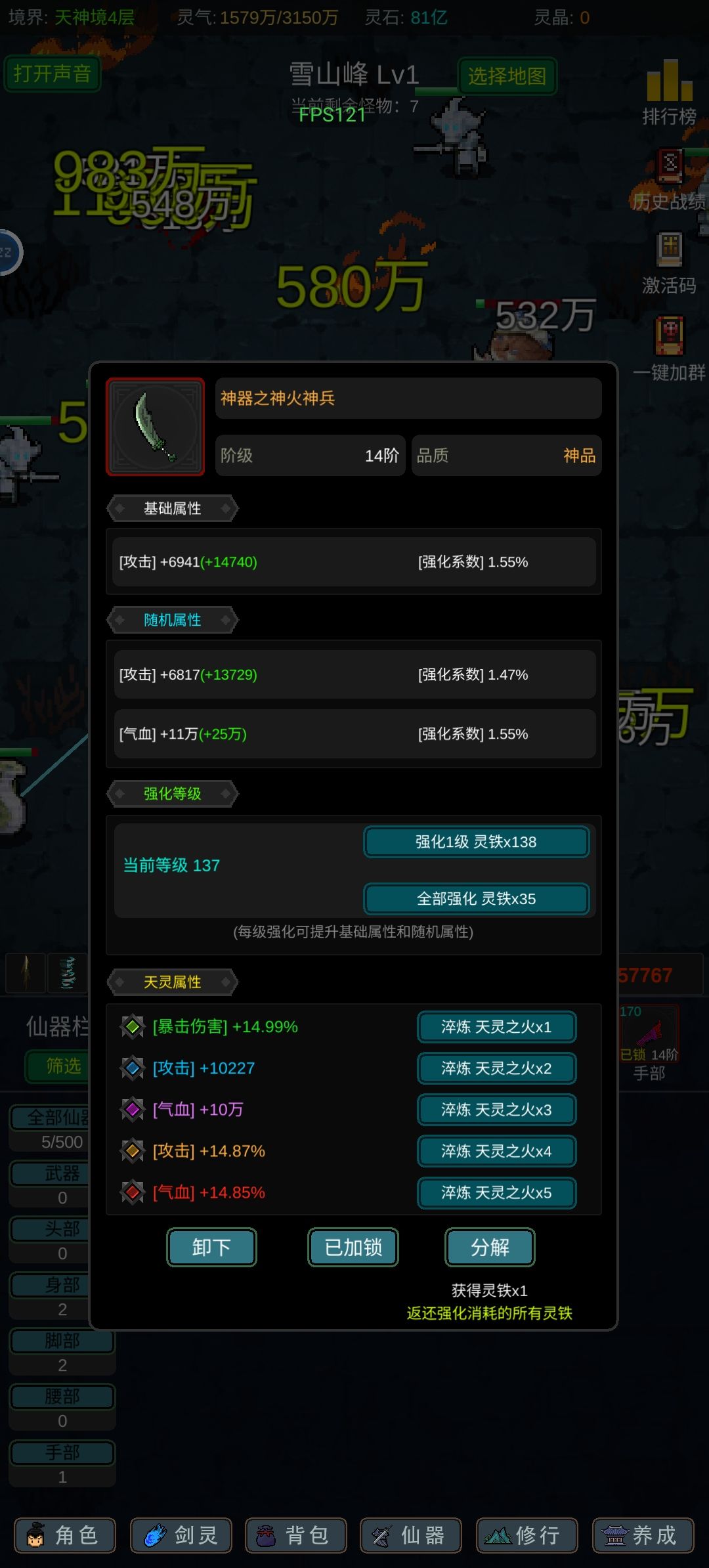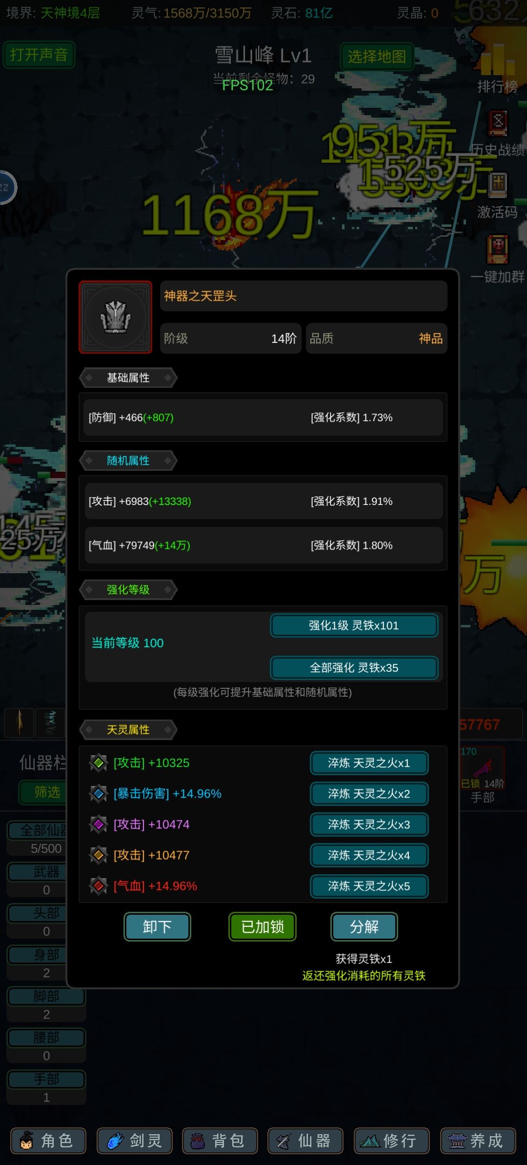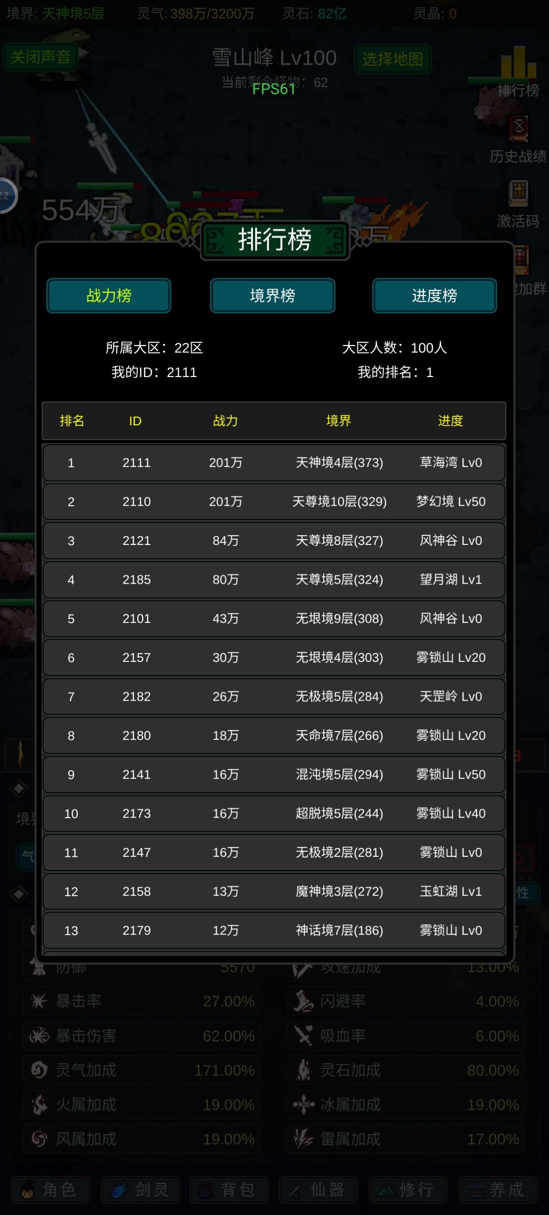 攻略应该有人写的七七八八了,我就不一一细说了,游戏内容也不算多,前期坚定一点只能玩“法修”就问题不大!其他的剑修、体修都是大后期才玩得起来,不然别说14阶,13阶都够呛能过,加点的话可以参考,我是法体双修过度到600级左右再转回法修,装备的话好坏看强化系数和词条,目前只有攻击和血量比较实用,过13阶大概需要血量300-400w,150w左右的攻击力,气运不同浮动很大,参考就好,等我过了14阶再回来补充。