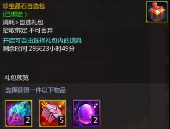 迷之蟠桃礼包(7天)*20、自选珍材宝箱(7天)*1、珍宝晶石自选包*2