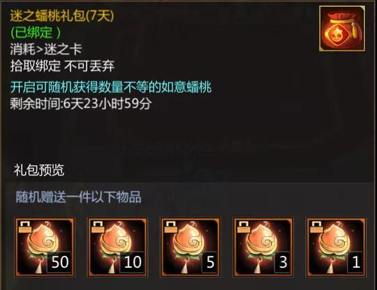 迷之蟠桃礼包(7天)*5、月之匙(1天)*10、暗金精炼石*10