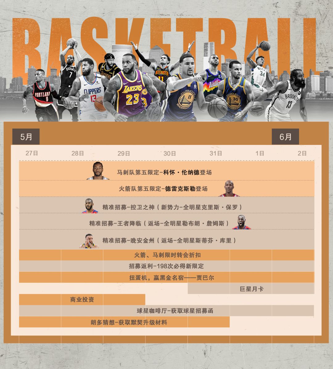 活动期间,将累计经理人在【限定招募】卡池中进行招募的招募次数,招募次数到达一定数量后即可领取进度奖励,奖励中包含巨星介绍信,可用于在招募商店中兑换限定球员。招募至198次,可领取限定球员二选一(限定德雷克斯勒、限定伦纳德)。