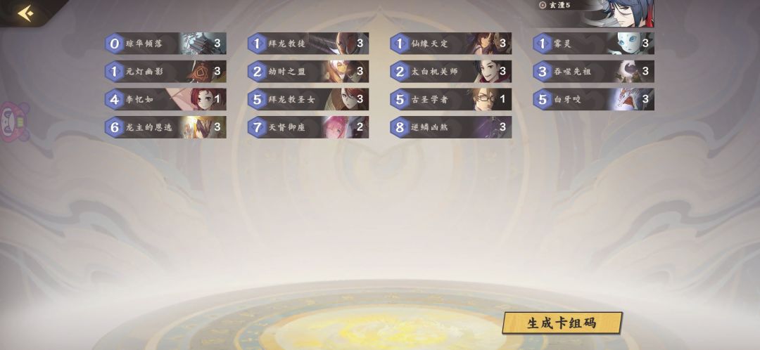 卡组思路:开局找琼华雾灵和机关师,叠血量,并过牌拿到关键卡牌,挨打叠逆鳞和龙主恩选,合适机会下圣女和龙主,正常情况下敌方血量被压到十几,逆鳞斩杀。
