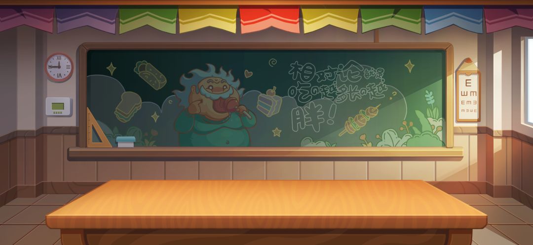 JJ:我觉得最有意思的是黑板上的内容,大家应该都体验过在学校我们的教室经常需要替换黑板海报吧。以前作为一名学生的时候就参与过教室海报设计,那时候用粉笔慢慢在黑板上画。在这张场景中加入的最有意思的设计就是“美食的相对论”的内容,很有意思的一句话,不是吗。