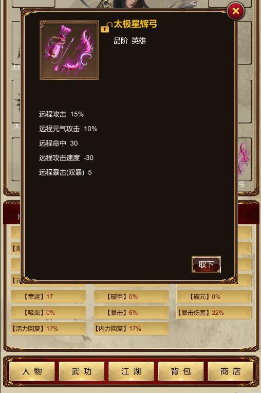 5)远程武功无发触发任何辅助武功,心法,天赋等