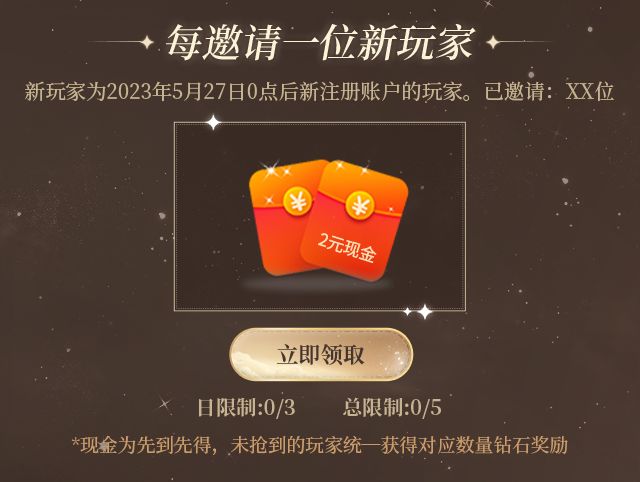 此外,邀请的甜蜜使者中,每有一位符合新玩家条件,邀请者还可额外领取2元现金奖励(新玩家为2023年5月27日0点后新注册账户;奖励单日限制领取3次,总限制领取5次;现金为先到先得,未抢到的玩家提现后统一获得钻石奖励)!