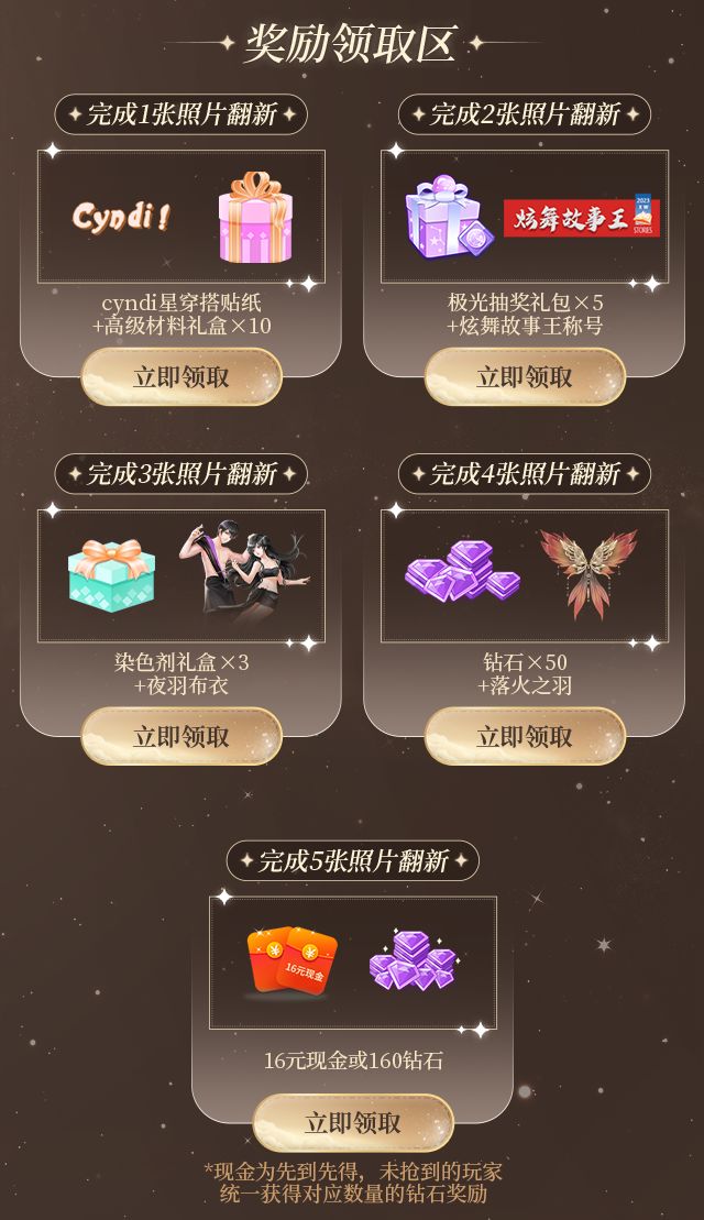 ↑点击上方图片立即前往活动↑5月27日至6月9日期间,玩家可通过完成任务或邀请甜蜜使者获得1支普通画笔或甜蜜画笔(甜蜜使者定义为: 2023年5月27日0点后新注册账号的新玩家或2023.5.20-2023.5.26未登录游戏的玩家),选择画笔对照片展示区域进行均匀涂抹上色,使其恢复色彩(Tips:每次需要涂抹一定距离才算涂抹成功,使用普通画笔需要4次才可上色成功,使用甜蜜画笔需要2次即可上色成功)~完成5张照片的上色,可在奖励领取区领取16元现金、夜羽布衣组合装、Cyndi星穿搭贴纸、炫舞故事王称号、钻石*50等对应任务奖励!