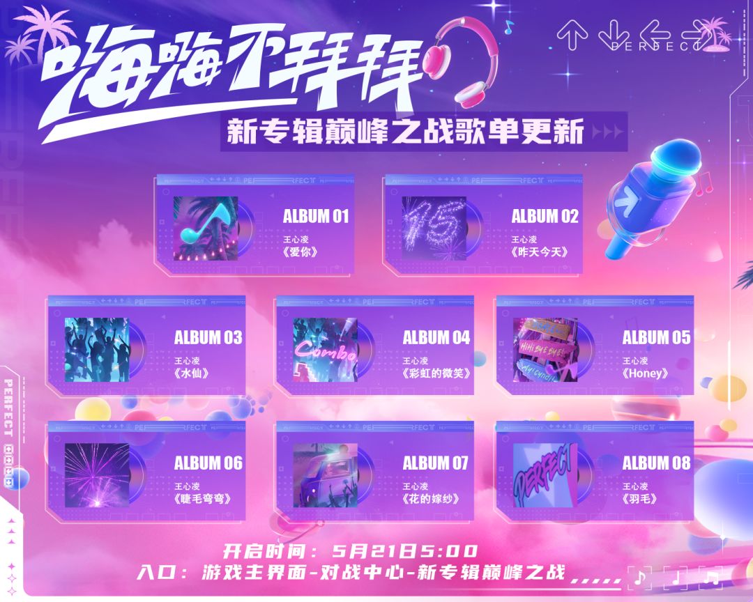 心凌打歌专辑-嗨嗨不拜拜已在游戏内上线,其中包含心凌《爱你》、《水仙》、《Honey》等多首经典歌曲哦~快来【对战中心-巅峰之战】参与打榜专辑关卡挑战吧!熟悉的旋律响起,重拾指尖与音符的青春记忆~