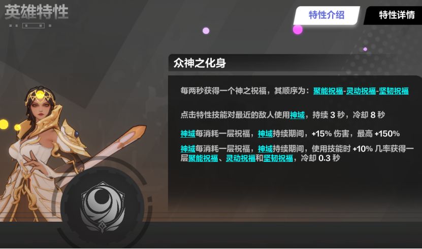 神域作用:当自身获得了任意一种祝福(先不管有几层),释放“神域”这个技能后,清除身上的祝福获得BUFF。持续3秒。