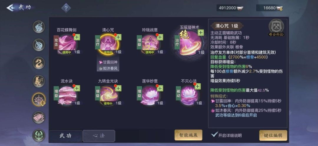 NO4:玲珑战意/流水诀,两个技能都是群体增益辅助技能,玲珑战意是可以增加群体内外功攻击和防御,自身增加内功攻击的BUFF技能,冷却时间较短,效果可以持续2分钟的时间。流水诀可为群体增加移动速度、普通攻击伤害的BUFF,同样持续2分钟的时间。两个技能的特殊招式都可以回复周围友方的血量。冷却时间都是15秒,施展时都能造成一次群体伤害,在战斗中可以积极使用。两个超强群体BUFF技能,技能优先级并列排在第四位。