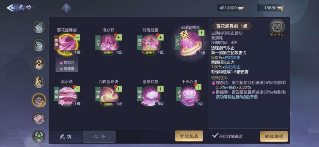 NO6:百花蝶舞剑,珑华流派除了普通攻击外,唯一的伤害技能。四连剑气攻击,第四招伤害最高,特殊招式还会减少敌人速度。珑华职业主要依靠的是团队治疗和团队BUFF技能,并不需要打出太多伤害,加点优先级排在最后。