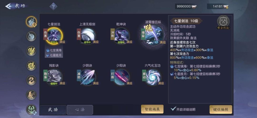 NO5:七星剑法/上清无极剑,两个主动伤害技能,都可以近身对敌人连续多段攻击,两者伤害较高,都有可以麻痹敌人的特殊招式,是凌云流派的两个主要输出技能,两个技能加点优先级并列排在第五。