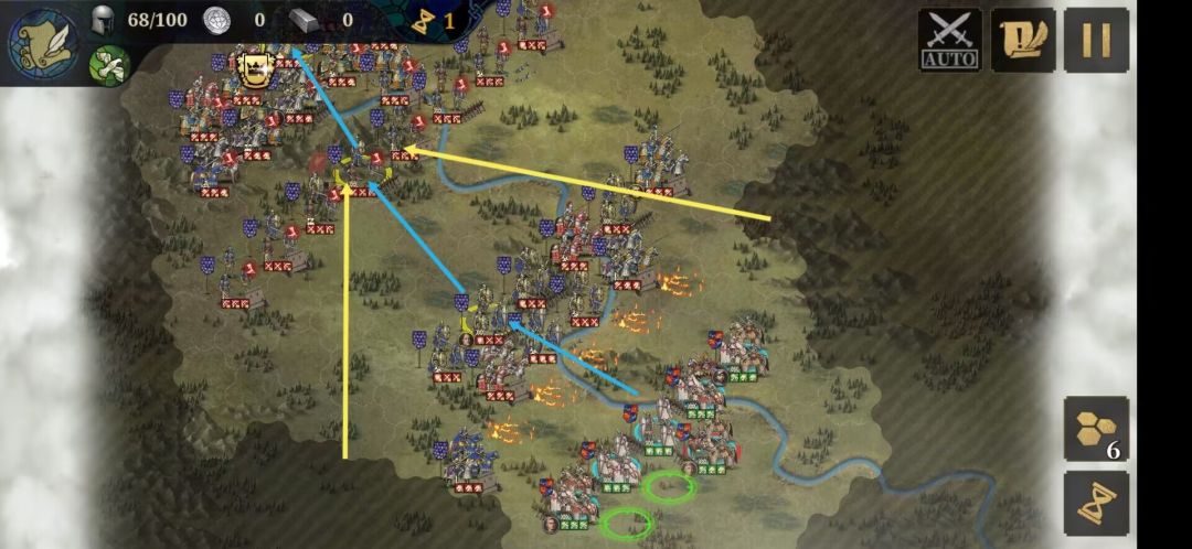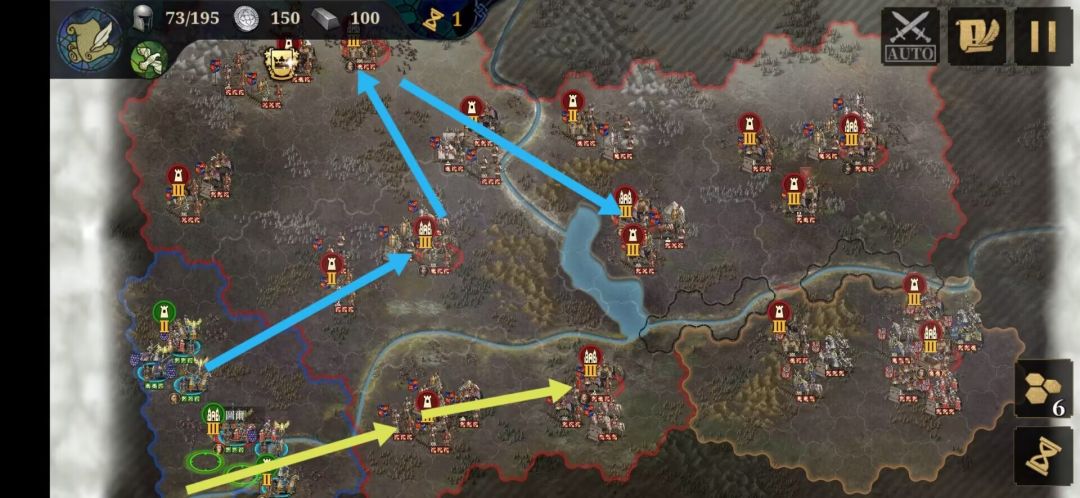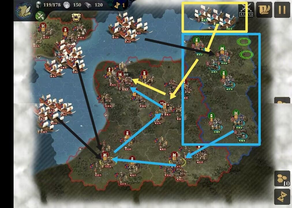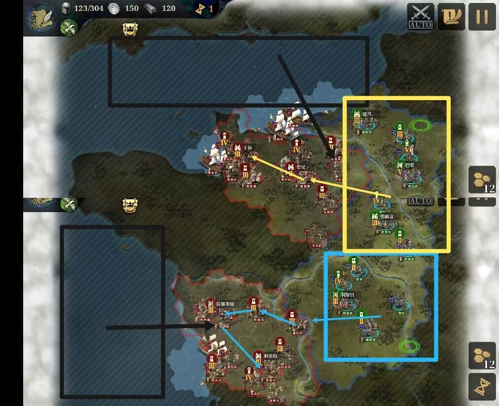黄框中的部队沿黄线守住大本营,随后配合主力蓝线进攻