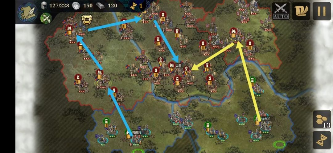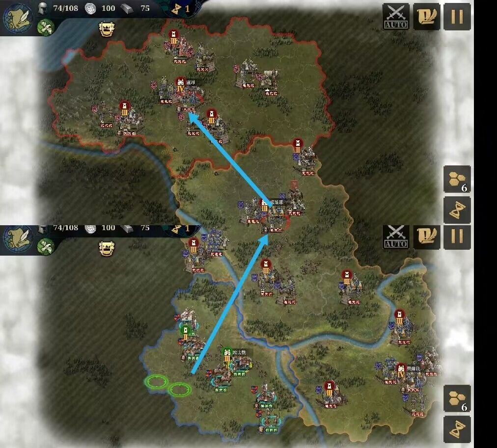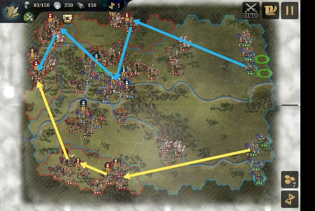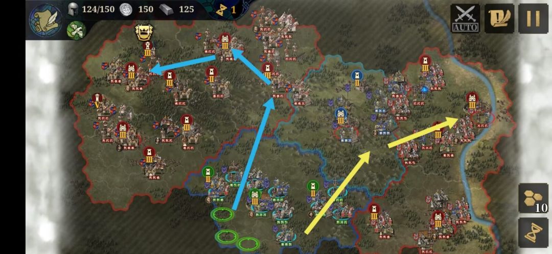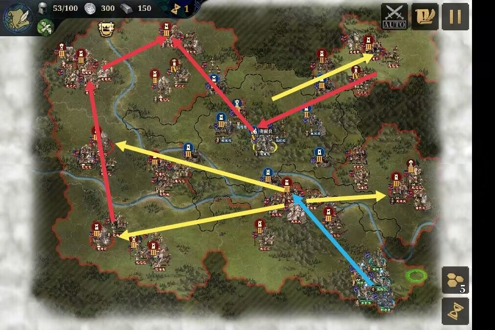 开局主力沿蓝线进攻,逐步攻占各个红圈城