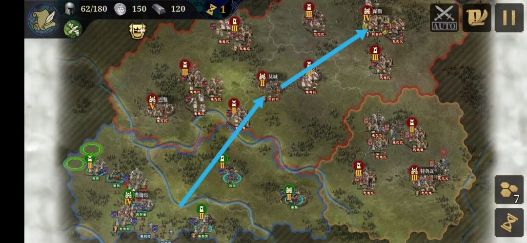 西南方部队沿蓝线逐个击破各个城池,并在最后与黄线主力会和,共同进攻巴黎