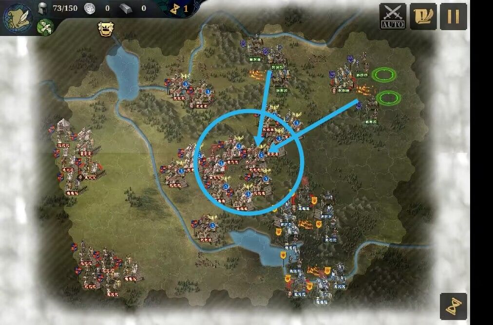 注意:本章节基本每关有驻军的城堡都会无限刷兵,在进入其警戒范围时(二格距离),会使该城堡刷兵并且进攻你,所以没事不要靠敌方城堡太近,注意走位