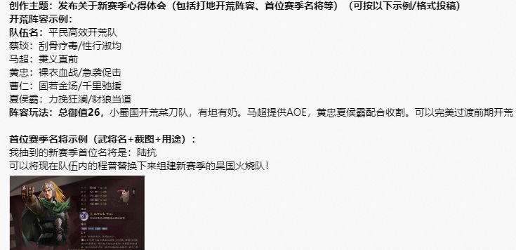 活动结束后将在全平台抽取发布开荒阵容分享的作者中抽取10位送出精美周边纸雕灯奖励*1活动结束后发布在全平台抽取发布首位赛季武将及用途的作者中抽取20位幸运儿获得三足酒樽套装*1