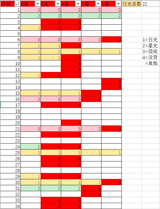 融装备测序最佳方案为第二张图,原理为6星必出刻印,所以6星确定序列各刻印为何物,然后垫刀阶段用4星去测出日光星光信徒的序列。4星出货的下次垫刀用3星测,不出货的下次用5星测。