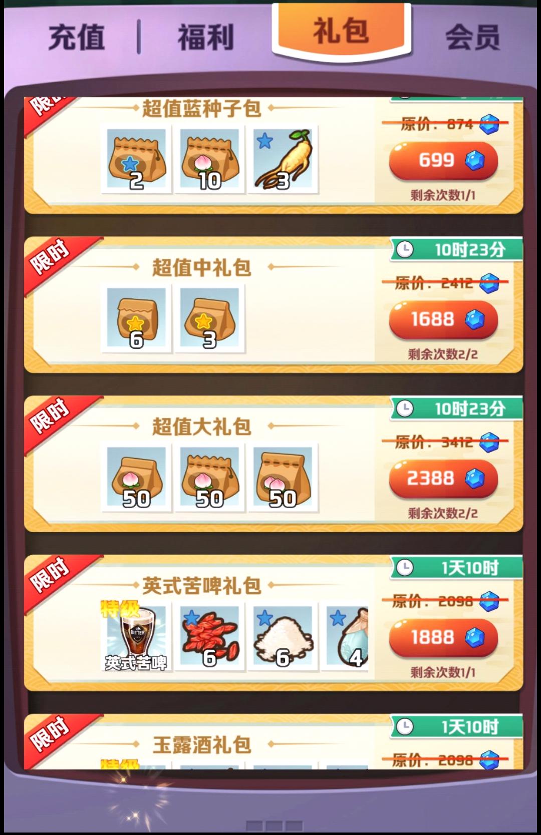 有的活动会出好多钻石购买的礼包,比如酒水、种子、厨娘升星升段等等。嗯…有时候太多礼包你要往下滑屏幕查看吧,不卡还好,一卡就…呵呵,不知道又按到了哪个购买。于是,嗖~一下你的钻石就没啦,小则几百,大则几千(惊不惊喜?意不意外?)
