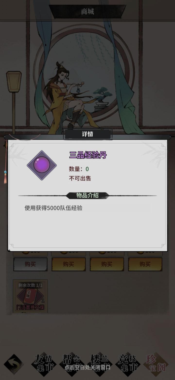 3.江湖集市,当我们存了一定的金龟时,我们就可以进行购物了,可惜,囊中羞涩,想买的东西太多,所以咱们可以优先购买经验丹,经过辰辰精打细算,最后发现三品经验丹是最划算的,100金龟可以买5个,每个拥有5000经验值,也就是100金龟可以购买25000经验值,而其他的丹药总经验是不如三品经验单的,所以说三品经验丹是我们优先购买的物品,其他的可以视情况而定!