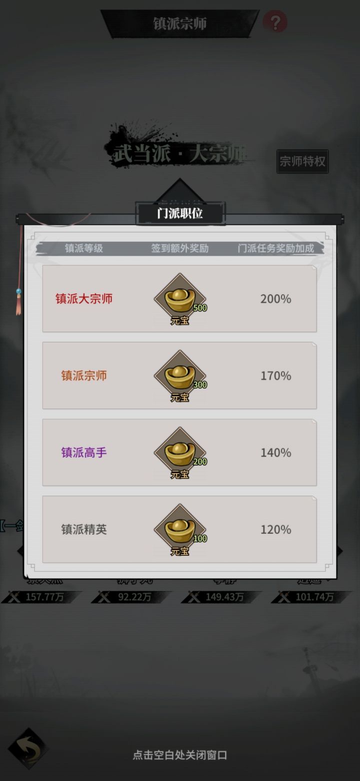 1.镇派宗师,顾名思义,这是一个门派用来衡量实力的地方,有能者居之,同样的,这个地方也大有文章,小伙伴点进去查看宗师特权,可以看到,镇派大宗师签到有额外的500元宝奖励,并且门派任务奖励签到翻倍,所以呀,咱们每天如果有实力的话,可以先抢夺一下首席的位置,然后再签到,任务奖励也是如此,当我们完成门派任务的时候,可以去抢夺一下首席的位置,然后再完成任务,这样我们获得的奖励就是翻倍了!记住哦,是完成任务的时候,不是开始任务的时候!