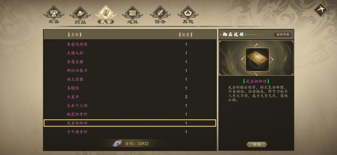 两本柔属性功法。首先完成传闻真武宝剑,会给一本武当初阳功。