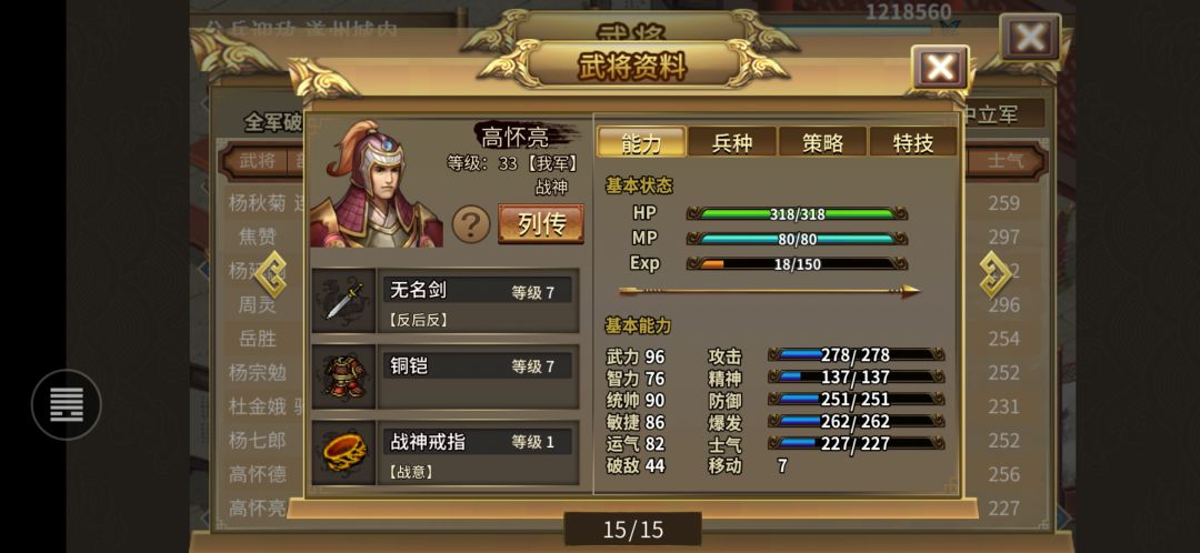 1218560 我镇守接天关后,杨延嗣的属性没有恢复,和同为战神的高怀亮比差一截。爆发力、攻击力一栏里对比就能发现。怀疑是bug