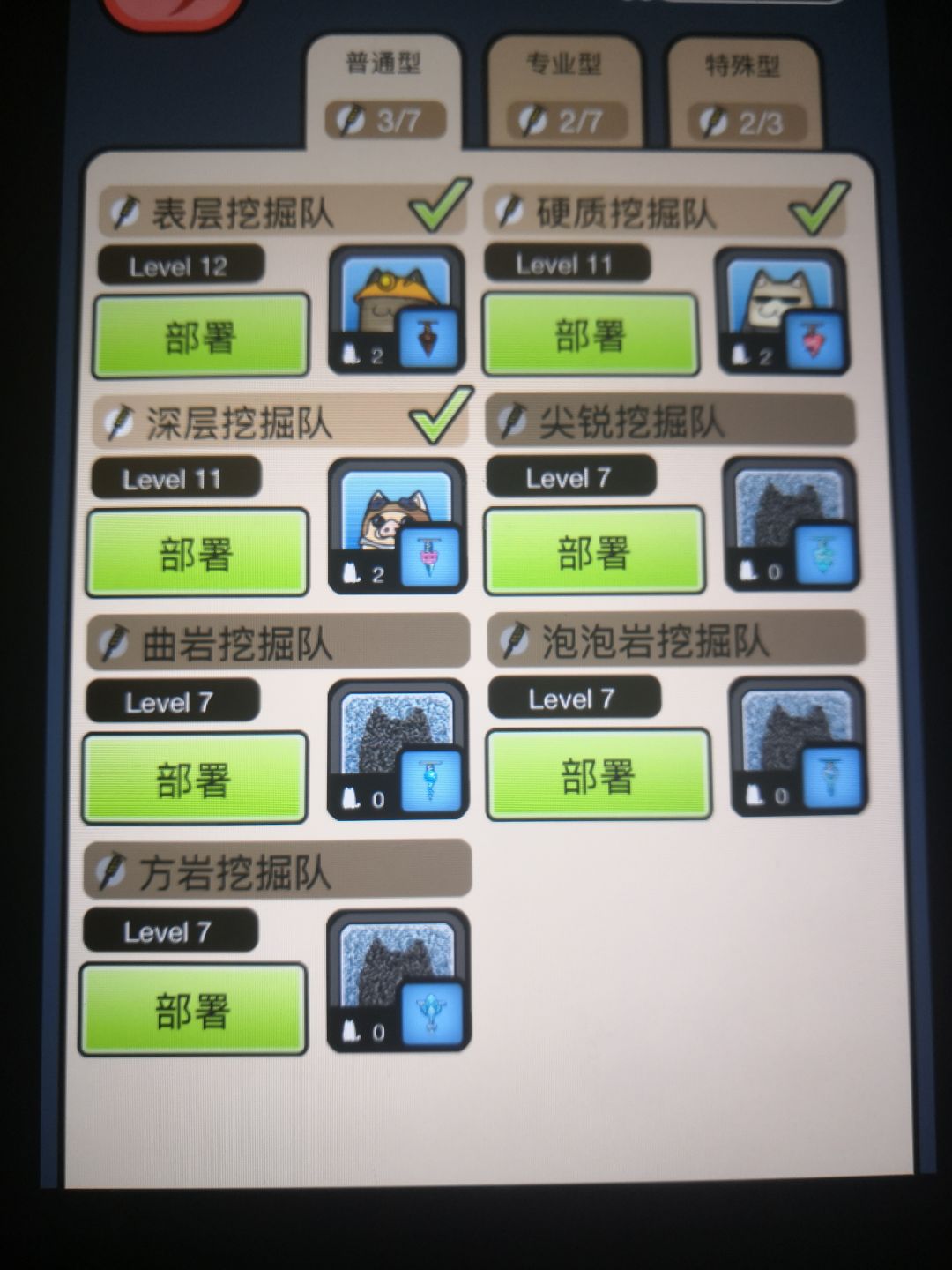 每只猫都要被安排进特定的队伍,也就是携带不同的挖掘器,专门挖掘某一种砖块。当然,也不是不能挖别的砖块,只是效率更低,耐久消耗更快。挖掘器有三大类,普通型,专业型,特殊型。