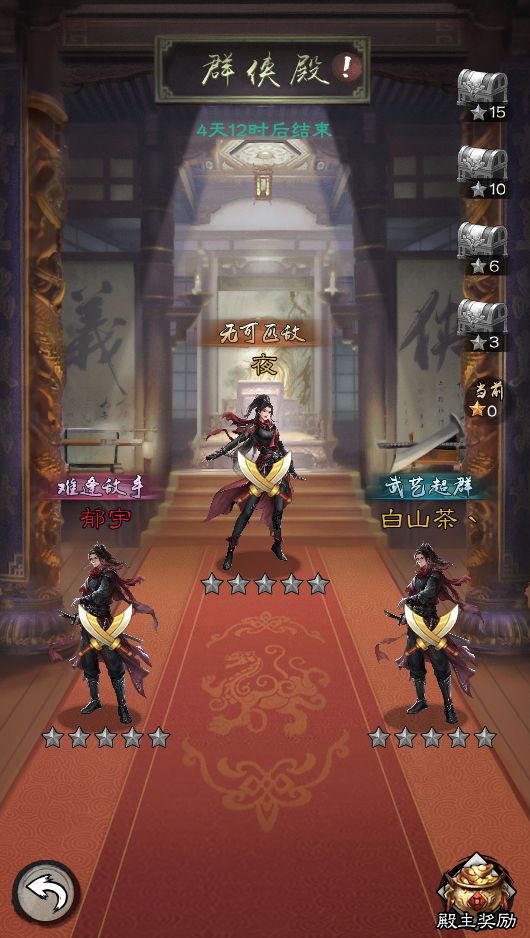 群侠殿内,侠客们可以相互挑战对应星级,获取丰厚奖励,更可以夺位成为殿主,获得专属称号奖励。