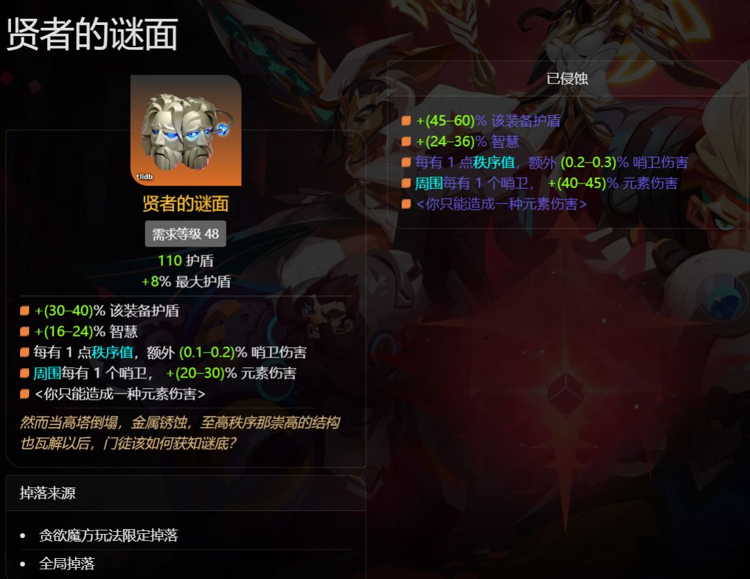 在由于前面核心装备的确定,所以只能选择法术哨卫,目前可考虑的哨卫技能还剩【聚焰之桩】,【寒霜之核】,【雷降之核】,而它们都是法术元素种类的伤害,让我想到了便宜且能提供抗性穿透的传奇智慧手套【贤者的洞察】。