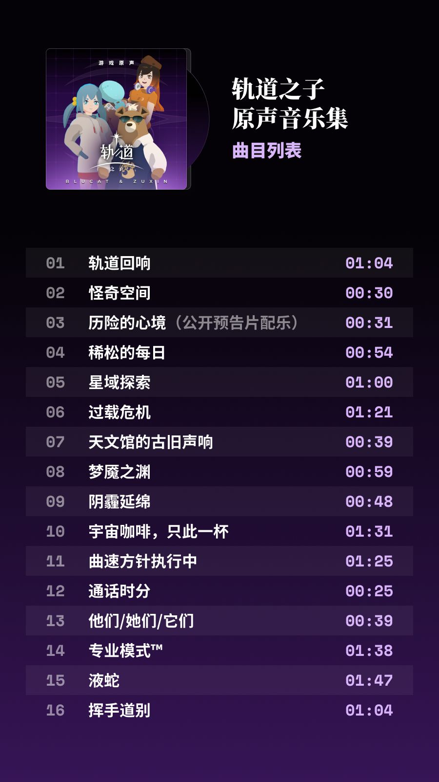 《〈 轨道之子〉原声音乐集》现已正式免费发布,收录《轨道之子》预告片、序章及第一章共 16 首曲目,愿轨道的声音弥漫在你我心间。